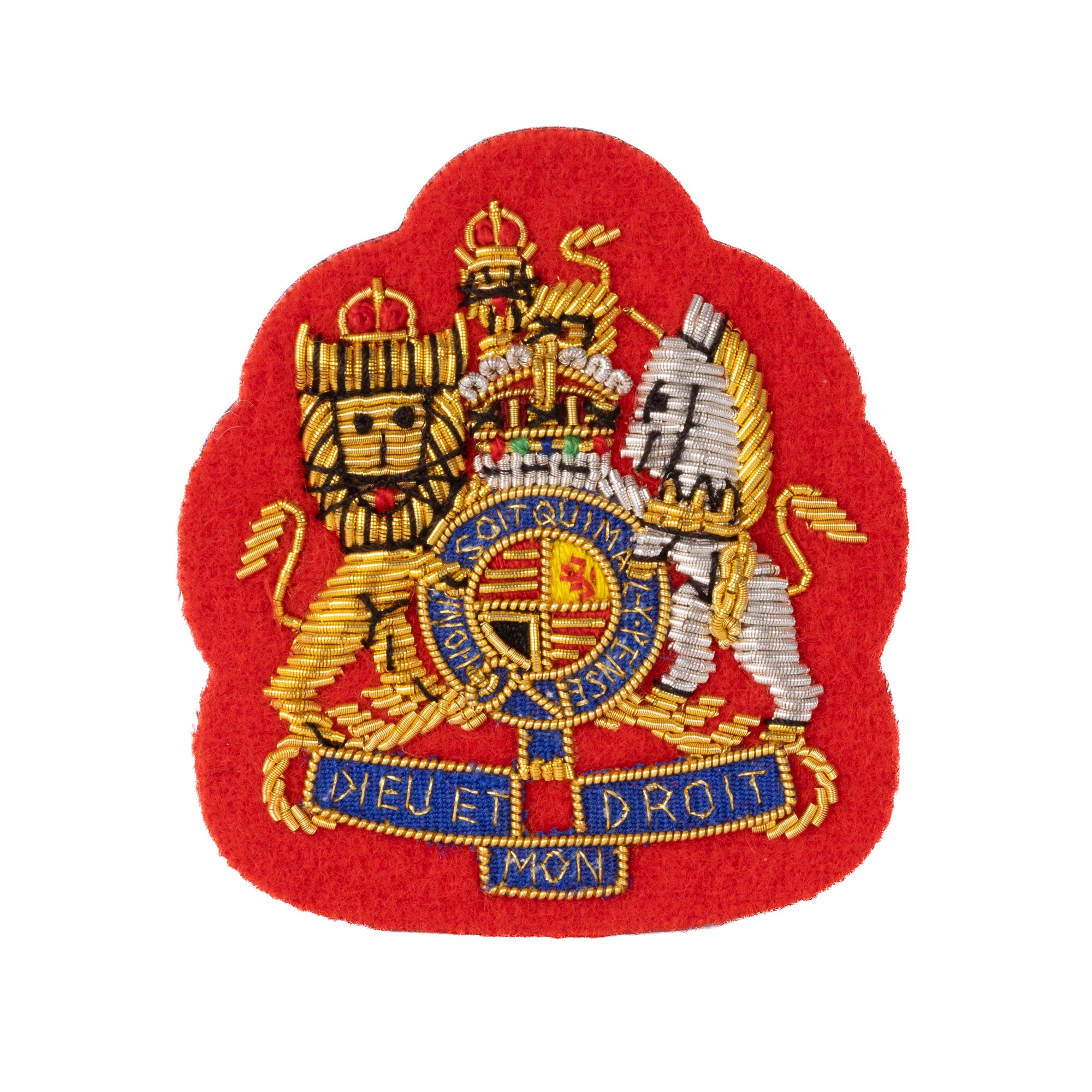 Highest quality gold wire embroidered onto a scarlet melton backing.