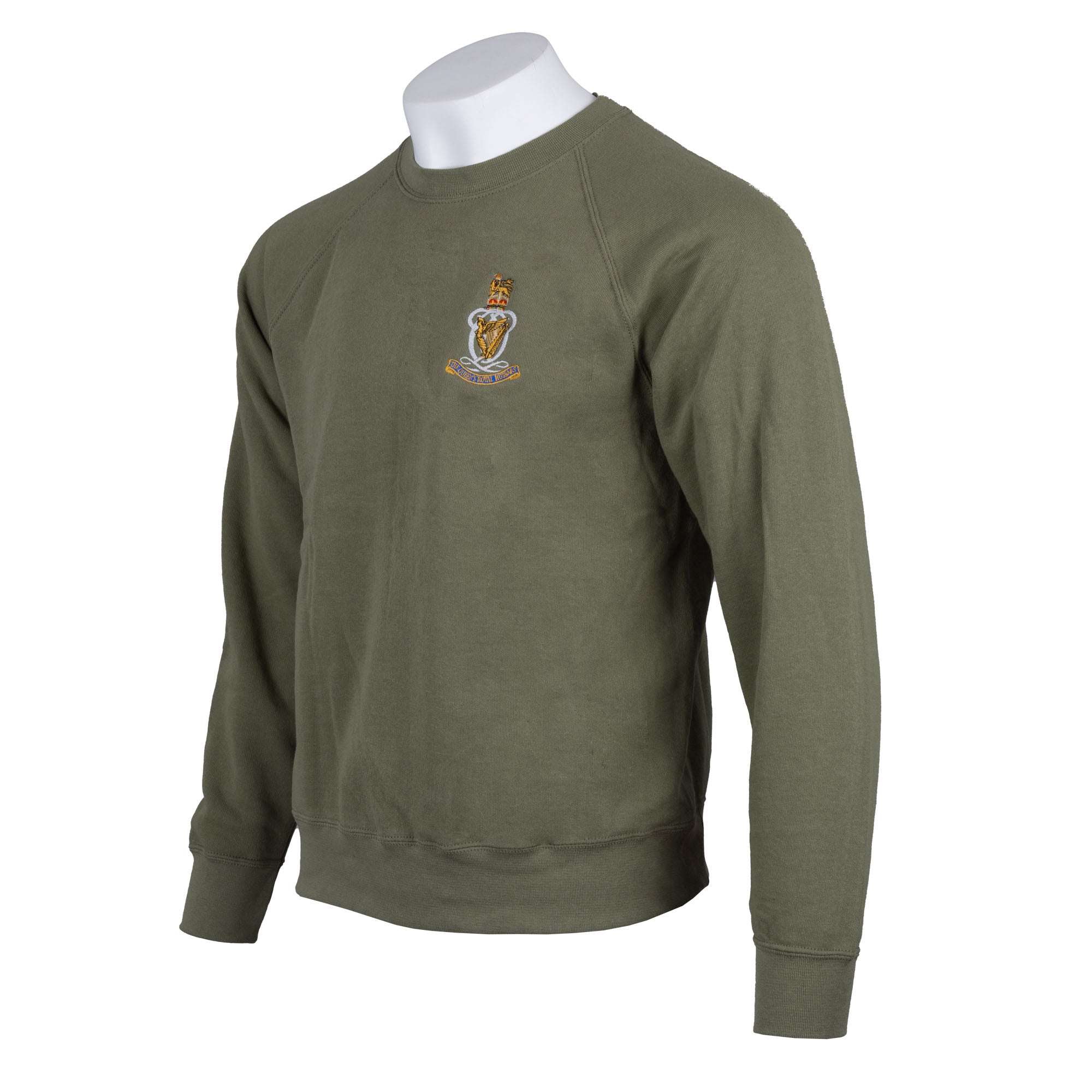 The Regimental Sweatshirt in olive with an embroidered cap badge on the chest.